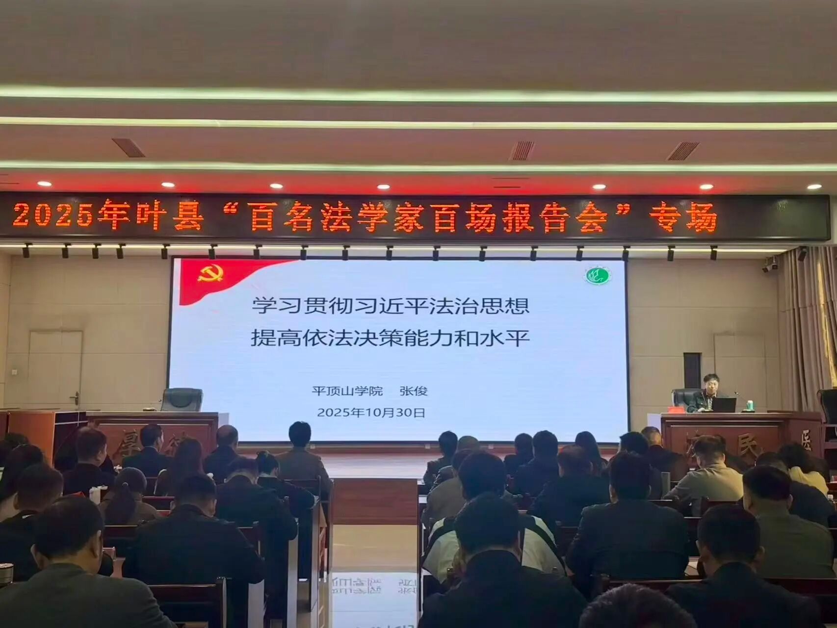 为深入学习习近平新时代中国特色社会主义思想,全面学习贯彻落实党的二十届四中全会精神,应叶县政法委的邀请,2025年10月30日在叶县新中医院报告厅,我集团习近平法治思想讲习所成员、廉洁文化与现代治理研究中心负责人张俊副教授为叶县政法委举办的“全县政法领导干部全面履职勇于担当专题研讨班”作了题为《学习贯彻习近平法治思想,提高依法决策能力和水平》的报告。报告会由叶县政法委副书记徐亚珍主持,共114位学员参加了报告会。